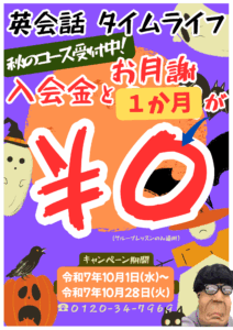 10月は特別キャンペーン開催中!By timelife / 2025-10-16 10月は超お得な英会話開始キャンペーンを実施中です。何と、入会金無料+1か月お月謝無料です!このチャンスをお見逃しなく☆